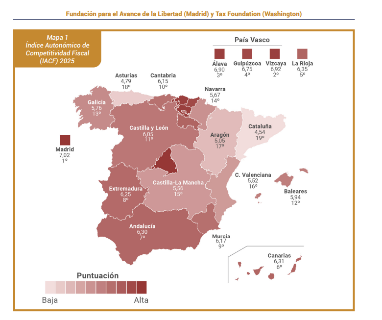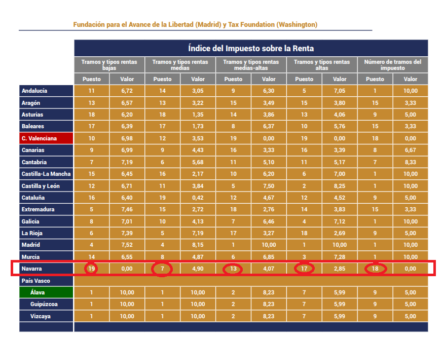 El Índice Autonómico de Competitividad Fiscal (IACF), que todos los años elaboran la Fundación para el Avance de la Libertad (Madrid) y Tax Foundation (Washington), permite a los gobernantes, empresarios y contribuyentes de una comunidad evaluar, medir y comparar su sistema fiscal con el de las demás. Navarra vuelve a salir malparada un año más. Que la Comunidad Foral es un infierno fiscal no es un relato sino una realidad. Somos un infierno fiscal comparados con el resto de comunidades autónomas y no digamos comparados con la propia Navarra en el pasado. Somos la única comunidad que teniendo un régimen foral lo usa para tener más impuestos que las demás. En el Indice obtenemos el puesto 14 de 19. La primera comunidad del ranking es por supuesto Madrid. Hay 19 puestos porque la CAV, al tener 3 diputaciones, ocupa 3 puestos. Eso sí, el segundo, tercero y cuarto. Los nacionalistas vascos gobiernan con un criterio para la CAV y con otro para Navarra. En una de las dos comunidades aplican una política fiscal que saben que no funciona, adivinen en cuál.