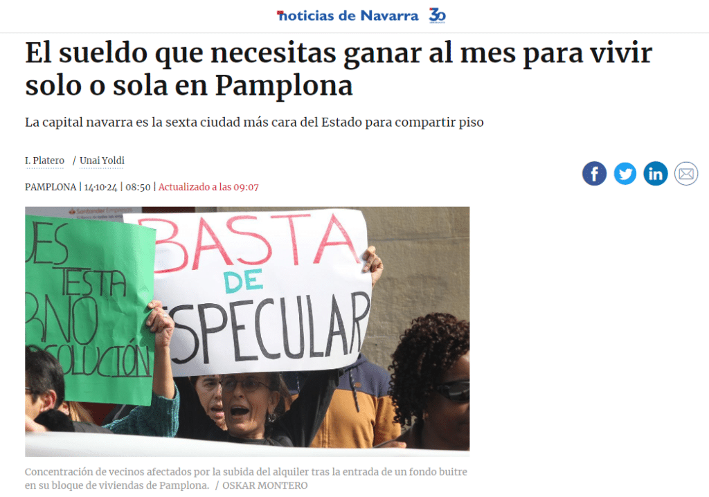 En el caso de Navarra, los precios del alquiler (no tanto los de la vivienda) no dejan de subir y subir. Nos encontramos en máximos históricos y no parece que la situación se vaya a revertir. Según el mismísimo Diario de Noticias, en las dos últimas décadas el sueldo medio de Navarra se ha incrementado sólo un 39%, mientras que la inflación acumula una subida del 57%. Según los datos de Idealista, el precio del alquiler mensual en Pamplona ha pasado de 7 a 11 euros el metro cuadrado, una subida de efectivamente el 57%. Pero no desde hace dos décadas sino desde el año 2015, desde que llegaron al gobierno los partidos de cambio y de progreso. Y vaya si han progresado los precios. Menos mal que la Educación y la Sanidad van como un tiro. ¿O lo que van como un tiro en la pierna son los impuestos?