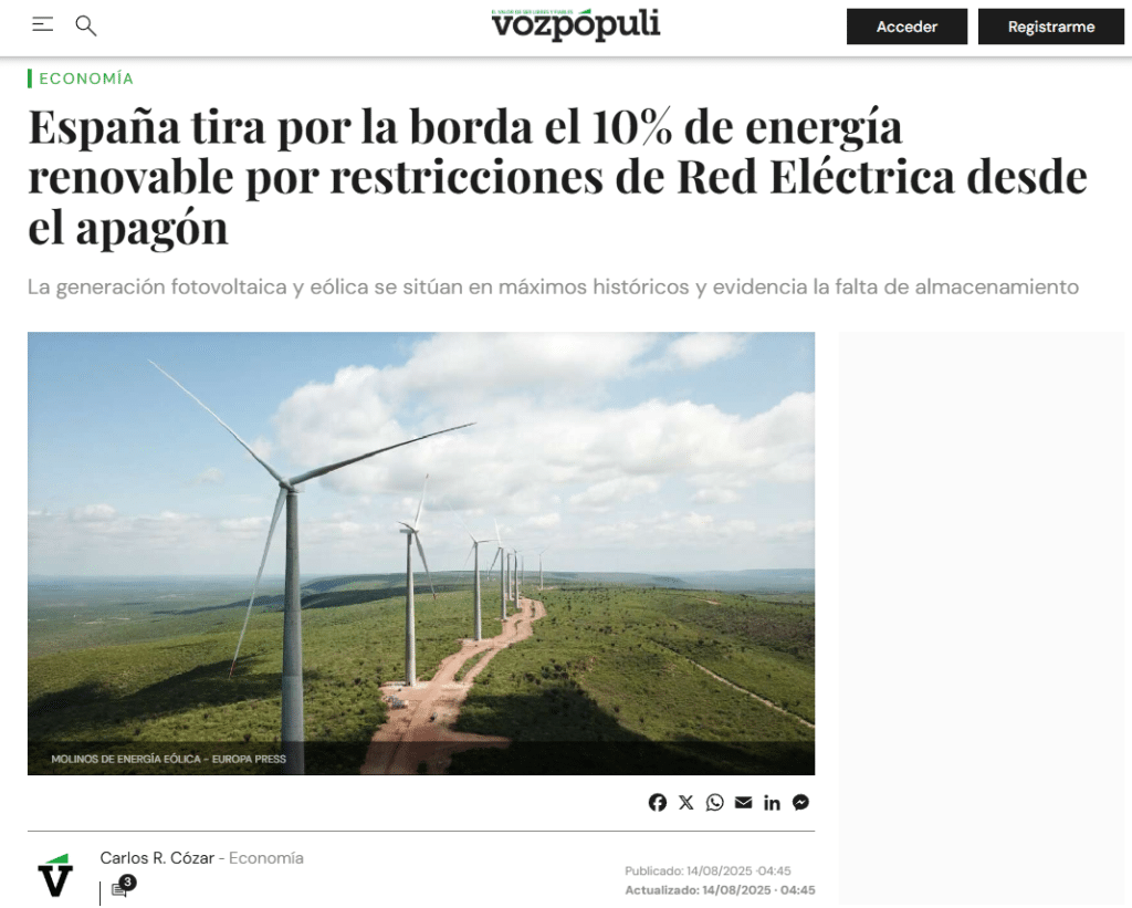 Lo que tenemos por el contrario es otro tipo de noticias, bien es cierto que no demasiado repercutidas, como que desde el gran apagón España está “desperdiciando” un 10% de la energía renovable que produce. ¿Cuál es la razón? Pues que esa energía no se puede meter en el sistema porque desde el apagón se está siendo más prudente con el mix energético y el porcentaje de renovables.