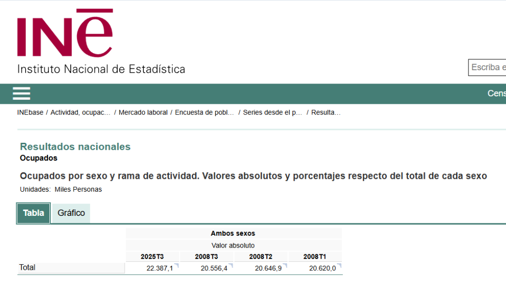 Un cálculo similar al del PIB es el que podemos aplicar al mercado de trabajo. En el año 2008 había en España 20,6 millones de ocupados, frente a los 22,3 de este año 2025. El gobierno presume de estar batiendo records de ocupación, pero volvemos a tener la sensación de que el mercado laboral sin embargo tampoco va como un cohete, por no insistir en la moto. Si en 2008 España tenía 45,6 millones de habitantes y 20,6 millones de ocupados, entonces los ocupados representaban el 45,17% de la población. Si en 2025 España tiene 49 millones de habitantes y 22,3 millones de ocupados, entonces los ocupados representan el 45,5% de la población. Es decir, que el nivel de ocupación parece de record pero en realidad es casi el mismo que hace 16 años. Y tener casi el mismo nivel de ocupación que hace 16 años es estar estancados. O como queramos llamar a estar 16 años con más o menos el mismo nivel de PIB real per cápita o el mismo nivel de ocupación.
