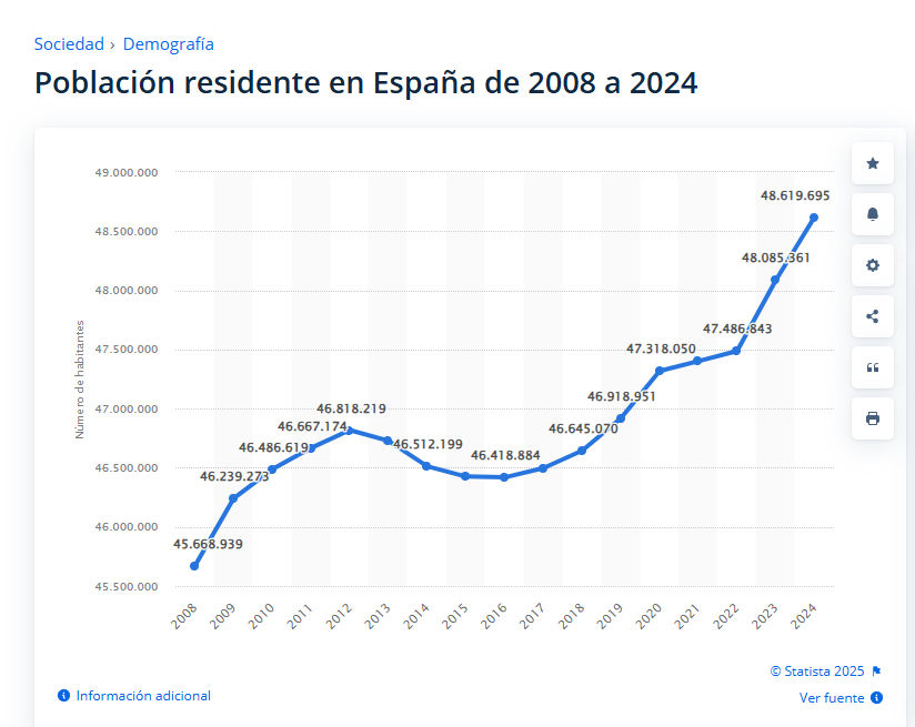 Efectivamente, el PIB a precios constantes, entendido como reflejo de la riqueza nacional, ha crecido un 14,4% desde 2008, pero es que la población española ha pasado de 45,6 millones en 2008 a 49 millones en 2024. Es decir, ha crecido un 7,4%. Si el PIB fuera una tarta, significaría que desde 2008 ha pasado de ser una tarta de 100 kilos a ser una tarta de 114,4 kilos, pero que ya no nos repartimos entre 100 personas, sino entre 107,4 personas. De este modo, el resultado es que apenas hemos crecido nada en términos reales desde hace 16 años. El trozo de tarta por habitante es casi el mismo ahora que en 2008. Normal que no sintamos que la economía española avanza como una moto.