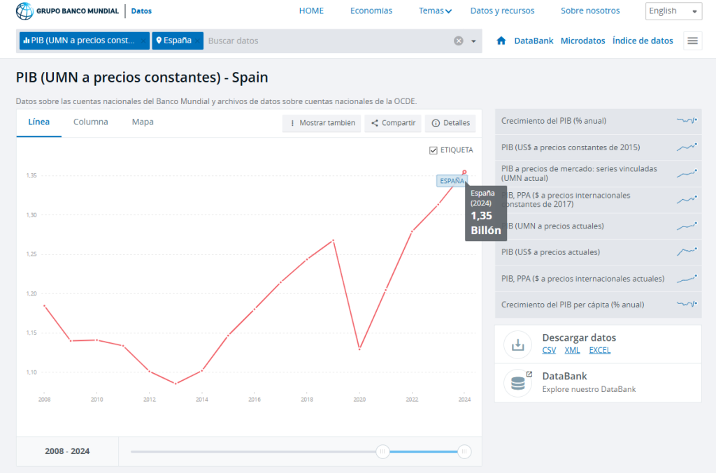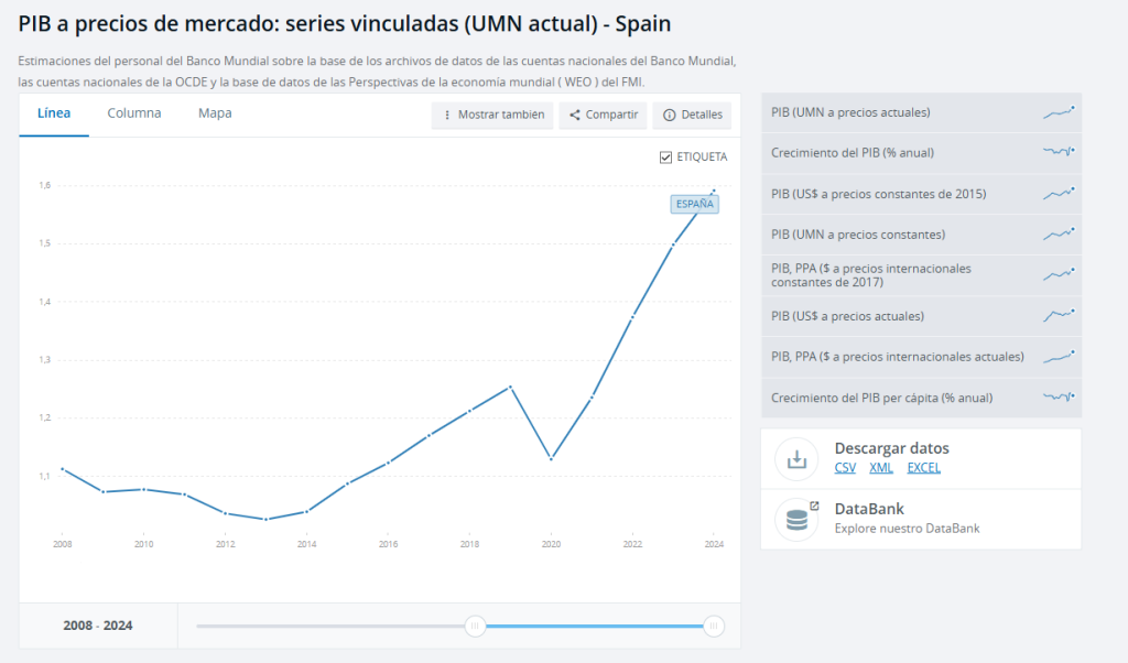 Al hablar de crecimiento económico solemos referirnos al PIB, como la cantidad de riqueza que genera anualmente un país, o lo que crece o decrece respecto a la riqueza producida el año anterior. El PIB de España en 2024 fue de 1,59 billones de dólares en términos nominales, pero antes de seguir y para acabar llegando donde queremos hay que hacer una importante consideración más respecto al PIB.