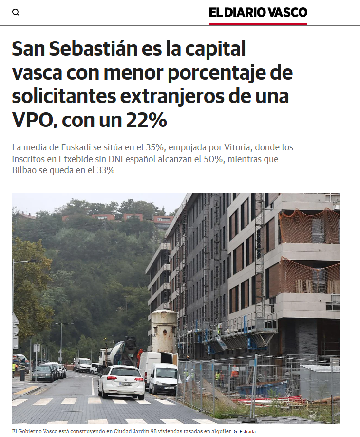 Por tratar de poner alguna cifra a las reflexiones y no dejar la reflexión limitada al mero plano de la lógica, publicaciones recientes indican por ejemplo que en la CAV más de un tercio de los demandantes de vivienda pública de alquiler son personas con nacionalidad extranjera. En San Sebastián este porcentaje se queda en el 22%, en Bilbao sube al 33% y en Vitoria el porcentaje se dispara al 50%. Lo que en cualquier caso resulta evidente es que la inmigración aumenta la demanda de vivienda, encarece los precios y desplaza a los demandantes nacionales, cuyas peticiones de vivienda social de alquiler tienen que competir con un 35% de peticiones de población extranjera.