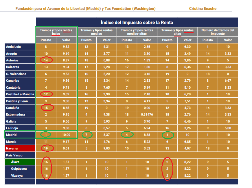 Por lo demás resulta que Madrid no es sólo la comunidad con los impuestos más bajos para los ricos. El recién publicado Índice Autonómico de Competitividad Fiscal del año 2024 pone de manifiesto que Madrid también es la comunidad con los impuestos más reducidos para las rentas bajas. Pareciera que en las comunidades más “progresistas” los ricos tienen los impuestos más altos y los pobres los impuestos más bajos, pero esto es otro bulo más de la izquierda. Lo que se aprecia por el contrario en la tabla es que los impuestos más bajos para las rentas bajas los tiene Madrid, mientras que las comunidades con gobiernos de izquierdas se caracterizan por tener los impuestos más altos para las clases bajas. LA CAV es la comunidad con impuestos más altos para los pobres y más bajos para los ricos. Bombardean a la gente de rentas bajas con bulos y con impuestos, y quieren reprimir la verdad.