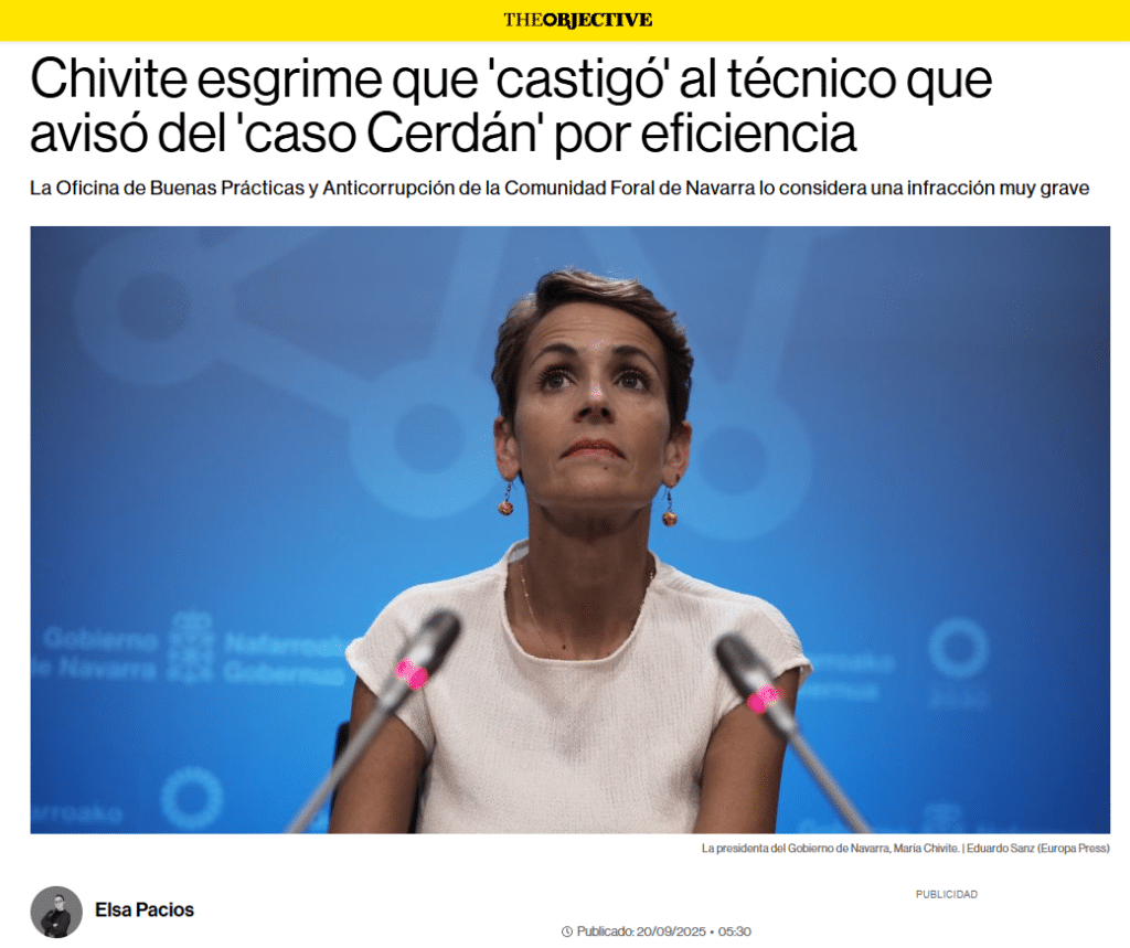 -El gobierno que preside Chivite, por otro lado, si algo ha hecho respecto a las denuncias en las irregularidades de Velate ha sido represaliar al funcionario de la mesa de contratación que denunció esas irregularidades.