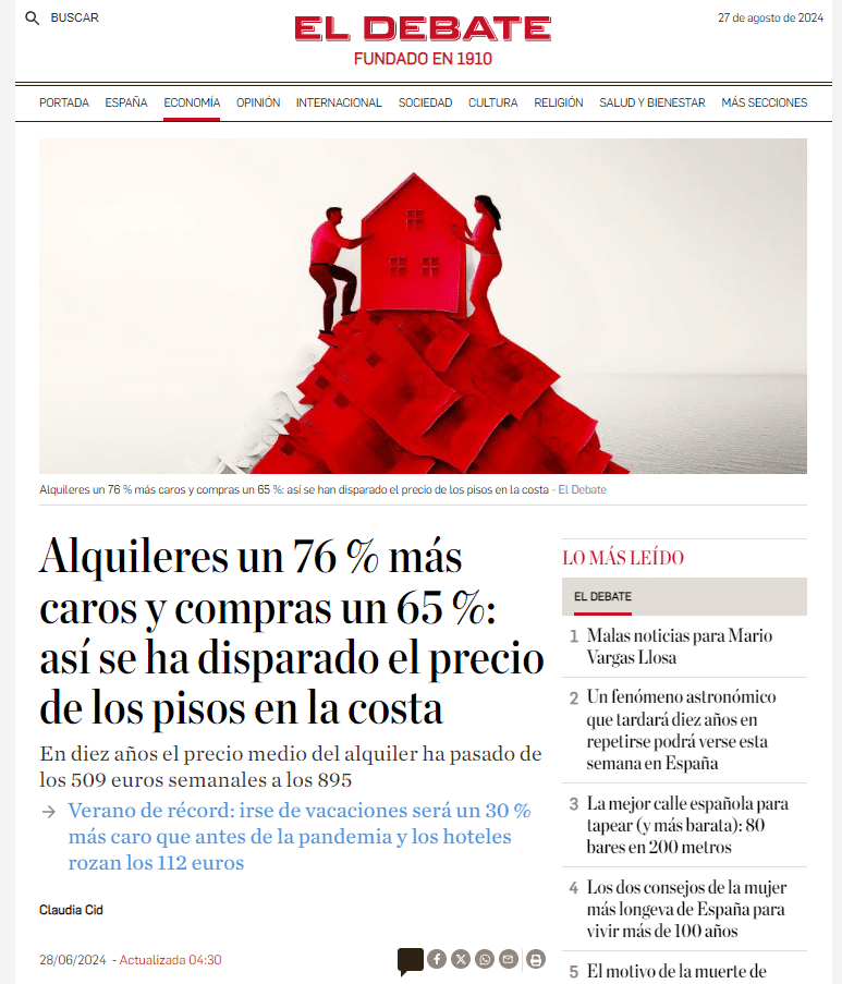 El otro problema es el de los precios de los apartamentos en primera línea de playa. Desde luego los mercados y los medios parecen discurrir por realidades distintas. Conforme a lo que publican los medios, la gente tendría que estar vendiendo despavorida sus apartamentos en primera línea de playa, casi regalados. Hace años que los precios se deberían haber desplomado. A estas alturas, nadie en su sano juicio debería estar comprando inmuebles en primera línea de costa. Por el contrario, los precios siguen y siguen subiendo. Tal vez porque, fuera de las portadas de los medios, la gente no aprecia que el mar se esté comiendo los apartamentos.