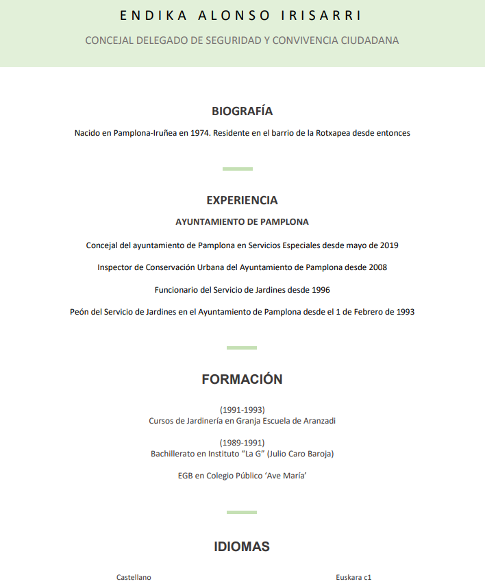 El currículum de Endika Alonso Irisarri, el concejal de Seguridad y Convivencia Ciudadana, no deja lugar a dudas sobre la nula cualificación de esta persona para encargarse del cargo que ocupa. La seguridad en Pamplona se encuentra encomendada una persona que no tiene más que el bachillerato y un curso de jardinería. ¿Qué formación tiene esta persona para encargarse de un apartado tan importante como la seguridad? Ante una situación de deterioro de la seguridad tan alarmante, ¿es esta la cualificación del responsable de seguridad que merece Pamplona? Y si evidentemente no es por su cualificación, ¿cuál es el motivo de que esta persona ocupe este puesto? ¿Su disciplina política? ¿Su devoción a Asirón?