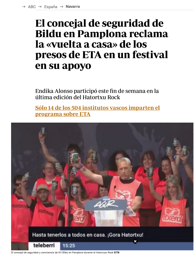 ❌ Rechazamos y condenamos las palabras del concejal delegado de seguridad y convivencia ciudadana Endika Alonso en el festival Hatortxu en apoyo a etarras.