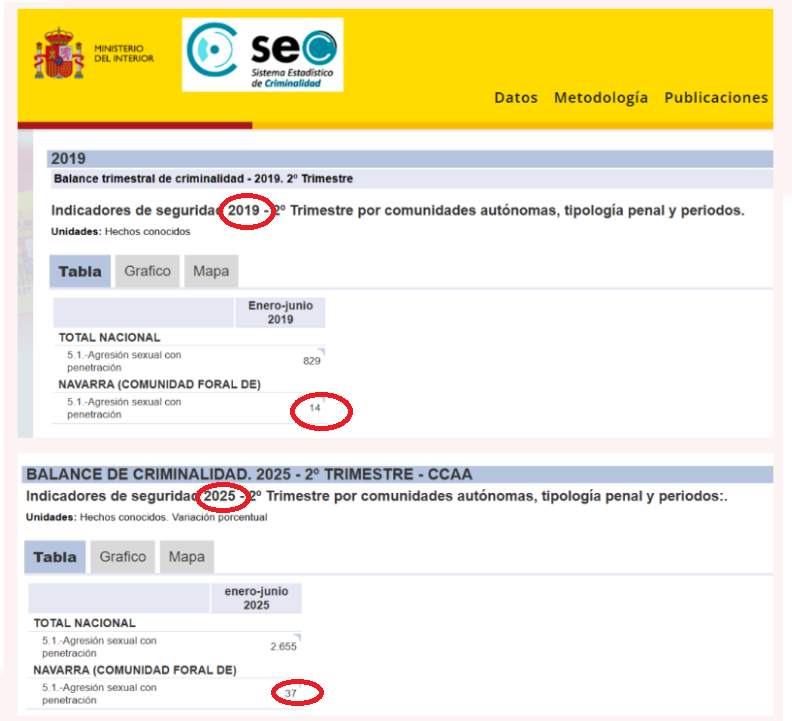 El caso de la manada magrebí ha vuelto a poner sobre la mesa el alarmante problema de la inseguridad en Pamplona. Hoy mismo es noticia nacional que Navarra es la comunidad española en la que más han crecido en lo que llevamos de 2025 las agresiones sexuales con penetración, un 48%. El dato es mucho más preocupante si nos remontamos a 2019. Las violaciones desde entonces se han multiplicado por 2,6. En el segundo trimestre de 2025 llevamos 37 agresiones sexuales con penetración en Navarra, 1,4 por semana. Esta es la Navarra real según los propios datos oficiales en los balances de criminalidad del Ministerio del Interior. El gobierno archifeminista de Chivite no ve sin embargo ningún problema de seguridad aunque casi se hayan triplicado las violaciones. Nada por lo que preocuparse. Nada que resolver. Se triplican las violaciones y el gobierno dice que no pasa nada. Las asociaciones y plataformas “feministas” tampoco dicen nada contra esta indiferencia del gobierno. No se manifiestan, no exigen medidas, ni siquiera denuncian el problema. Estas asociaciones y plataformas supuestamente feministas que cuelgan del presupuesto existen para defender al gobierno, no a la mujer.