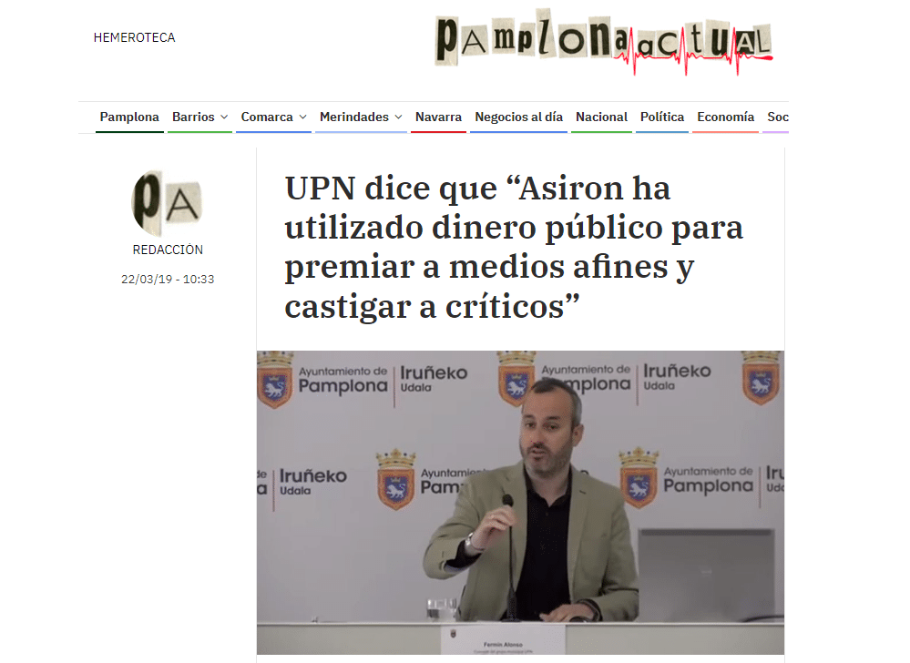 Bueno, quizá también hay otra cosa garantizada, y es que algunos medios, casualmente el tipo de medios que se deshacen en alabanzas a Asirón, son medios que se ven positivamente discriminados por Asirón en el reparto municipal de fondos para publicidad. Recordemos que en su anterior legislatura, con los peculiares, innovadores y según el TSJN ilegales criterios de reparto de fondos de Asirón, el ratio resultante de dividir la inversión publicitaria entre lectores era de 1,84 € para el Diario de Navarra, 2,37 € para el Diario de Noticias, 2,5 € para Berria y 3,33 € en el caso del Gara.