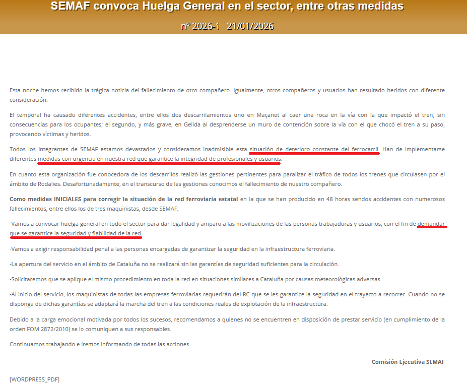 Para que no queden dudas, la cuestión es tan sencilla como acudir al comunicado del propio SEMAF y verificar cuáles son los términos de la convocatoria de la huelga y las reivindicaciones se plantean. Como puede apreciarse, los maquinistas denuncian la “situación de deterioro constante del ferrocarril”, e indican que se convoca la huelga “con el fin de demandar que se garantice la seguridad y fiabilidad de la red”. La nota de los maquinistas también reclama “medidas con urgencia en nuestra red que garantice la integridad de profesionales y usuarios”. Sin duda los maquinistas están, como todos, doloridos por las muertes, pero convocan la huelga denunciando la situación de la red ferroviaria y exigiendo medidas de seguridad.