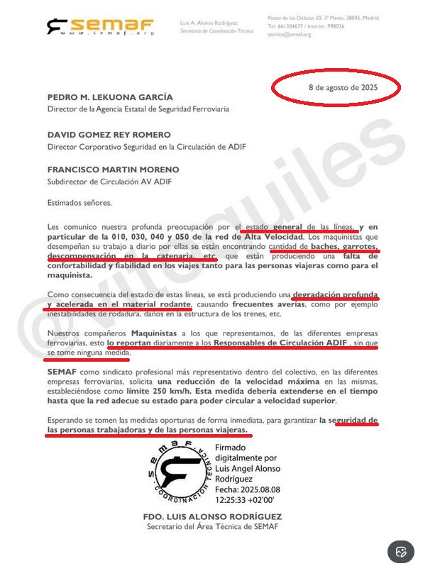 No sólo eso. El SEMAF también emitió un comunicado el pasado verano advirtiendo de la mala situación general de la red ferroviaria y de las líneas de alta velocidad. En ese comunicado se denunciaba no sólo la “cantidad de baches, garrotes, descompensación en la catenaria, etc”, sino que todos esos problemas los maquinistas los reportaban “diariamente a los Responsables de Circulación ADIF, sin que se tome ninguna medida”.