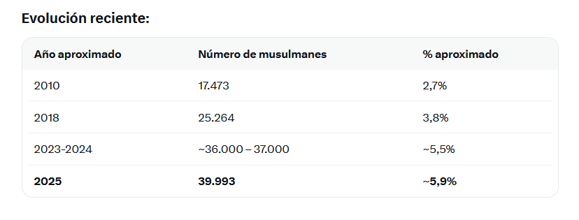 Según los datos de la UCIDE (Unión de Comunidades Islámicas de España), que podemos unir a los citados del Observatorio del Pluralismo Religioso, actualizados en 2025, el número de musulmanes en Navarra rondaría los 40.000, acercándose al 6% de la población. Es interesante no sólo la cantidad sino la evolución, que lógicamente sólo se entiende a través de la inmigración.