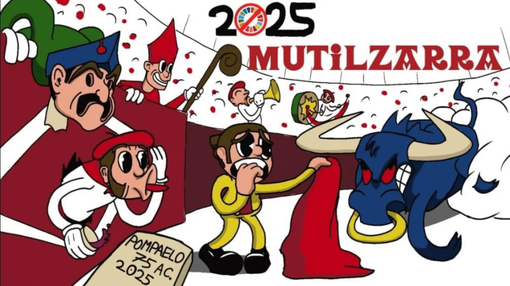 La peña Mutilzarra también ha presentado recientemente su pancarta para este año, siguiendo la línea del año anterior, con un mensaje de defensa y mantenimiento de nuestras tradiciones más arraigadas. De este modo, la pancarta pone el foco este año precisamente en las corridas de toros, una de las escenas más emblemáticas de los Sanfermines.