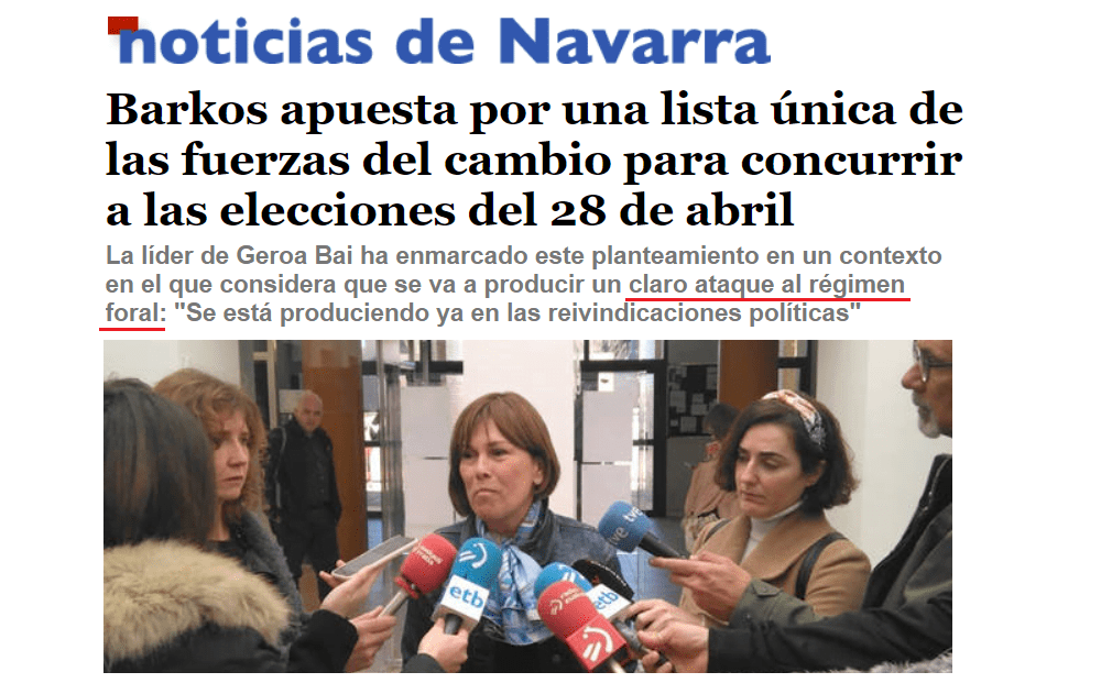La primera reacción de Uxue Barcos al anuncio del adelanto electoral fue proponer una alianza electoral entre todas las fuerzas del cambio: «Yo sí veo que la necesidad de que esa capacidad de acuerdo que ha sustanciado un Gobierno estable, sólido, que ha traído bienestar al conjunto de la ciudadanía en Navarra, se encuentre también, en la fórmula que sea, no me corresponde a mi sola establecerlo, en una representación en la misma dimensión para la defensa del autogobierno de Navarra». Las palabras de Uxue Barcos vuelven a mostrar que la presidenta es capaz de decir en cuatro líneas lo que el resto del mundo es capaz de decir en una, que su atractivo es escaso porque Podemos e IU se descolgaron de la alianza al momento y que la líder de Geroa practica un humor surrealista, porque sólo como una broma surrealista se puede entender los partidos del cambio representen la defensa del autogobierno de Navarra. Podemos defiende la autodeterminación del más pintado, pero predica en cambio la armonización fiscal de todos los países de Europa, como por cierto en el fondo el PSOE, y hasta como el PNV de muga vasca para adentro. Bildu es la formación heredera de quienes han pegado tiros en la nuca por negar que Euskadi (Euskadi Ta Askatsuna) y no Navarra es un sujeto político. Y la propia presidenta, para rematar el sketch surrealista, nunca ha negado que ante un hipotético ejercicio de la Transitoria Cuarta ella votaría que Navarra se convirtiera en una mera diputación vasca sin apenas autogobierno ni competencias. Pero resulta que ella, el aberchalato y toda su cuatripandilla representan la defensa del autogobierno y no su peor y más real amenaza.