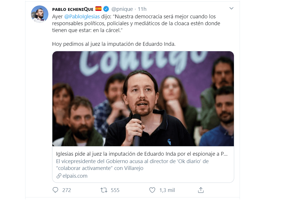 Es posible que en los últimos días estemos pasando por alto algunos de los riesgos que podemos tener que enfrentar en el hipotético caso de que consigamos sobrevivir al coronavirus. O en el caso de que sobrevivan al coronavirus Pablo Sánchez y Pedro Iglesias. El nivel de amenaza a la libertad ha escalado varios peldaños en las últimas horas. El fin de semana Pablo Iglesias creaba una categoría de periodistas cloaca, en la que daba la impresión de que sería incluido todo el que llevara la contraria o no le gustara a Pablo Iglesias. Ayer la amenaza era directa e individualizada a través del lacayo Echenique que ya pide meter a Eduardo Inda en la cárcel. Pero no hablan, que ya sería bastante preocupante, como si quisieran meter sólo a Inda en la cárcel, sino a cualquier periodista molesto. Irónicamente, la que cenaba, bromeaba y complotaba con Villarejo era la nueva Fiscal General del Estado.