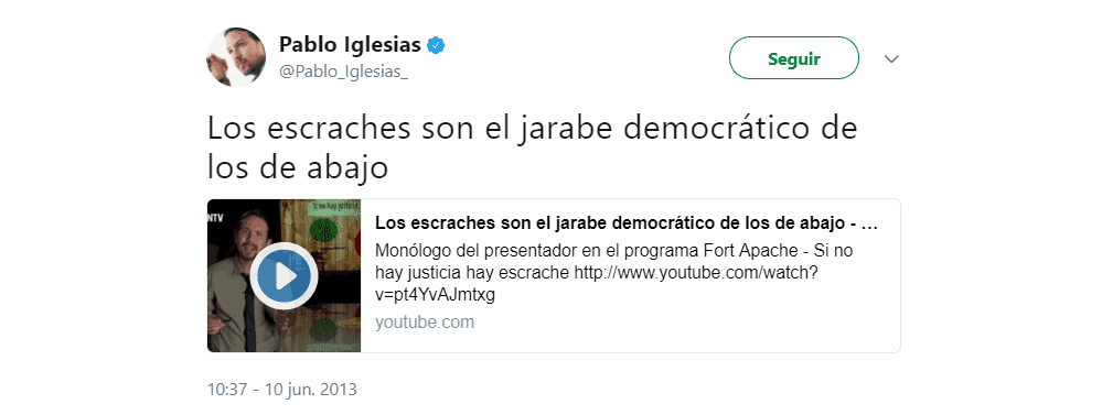 “A mí me hace mucha gracia que algunos partidos critiquen los escraches y los abucheos organizados a ciertos políticos. No se me olvida cómo Rosa Díez y María San Gil insultaban a gritos a dirigentes del PNV, o cómo ciertos militantes del PP se hicieron famosos echando a Pepe Bono de una manifestación de la Asociación de Víctimas del Terrorismo. Ya era hora de que la derecha probara un poquito de su propia medicina. Lo que está claro es que los ciudadanos están hasta el gorro de algunos de sus representantes y de los escasos medios de participación democrática de nuestro sistema. Hay que decir que no es aceptable que los términos del debate político los tengan que marcar sólo los que gobiernan y recortan, hacía falta que se viera ya en los medios a la gente pidiendo cuentas a las élites, eso que los politólogos llamamos accountability. Y eso es lo que han conseguido los escraches, en una palabra democratizar los debates políticos, pues al interpelar a las élites directamente, los escraches han desbaratado el reparto de papeles entre el político emisor del discurso y los ciudadanos, receptores pasivos, por eso no me canso de decir que los escraches son, ante todo, el jarabe democrático de los de abajo”.