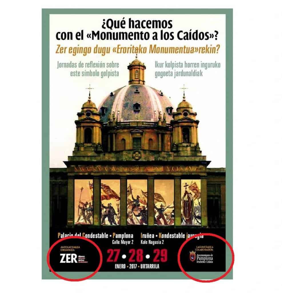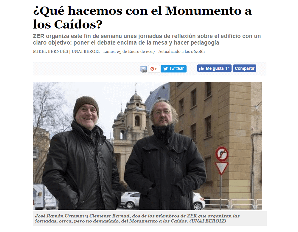 En una entrevista publicada en enero de 2017 por Diario de Noticias, dos militantes del colectivo ZER, José Ramón Urtasun y Clemente Bernad, explicaban esas jornadas de debate sobre qué hacer con el Monumento a los Caídos. Bernard declaraba en la entrevista que “ Igual hay que llegar más lejos de lo que muchos piensan. Es más fácil quedarnos cortos, una plaquita… y al final no se desactiva su simbolismo porque este edificio se impone de una forma terrible”. Por su parte, Urtasun señalaba que “Están las leyes de memoria histórica y la Ley de Símbolos en Navarra, que dicen que hay que quitar placas, escudos y demás. Pero es que nosotros pensamos que el edificio en su totalidad vulnera la ley de memoria histórica. No es un escudo, es todo el monumento. ¿Cómo gestionamos eso?”