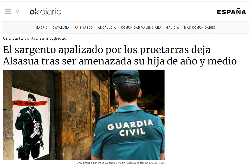 El sargento de la Guardia Civil apaleado en Alsasua y su pareja han decidido abandonar la localidad. El sargento ha pedido el traslado tras recibir amenazas dirigidas hacia su hija de año y medio. Cuando se consume este traslado, todos los agredidos de aquella noche habrán tenido que abandonar Alsasua.