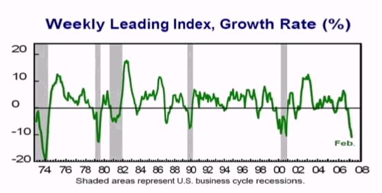 La siguiente gráfica muestra la evolución histórica del índice semanal que elabora el ECRI. Como puede apreciarse, las caídas de este índice son un buen indicador de las ocasiones (marcadas en gris) en las que la economía de los EEUU ha entrado en recesión. Nunca en el pasado una caída del índice a los niveles actuales ha dejado de ir acompañada de una recesión.