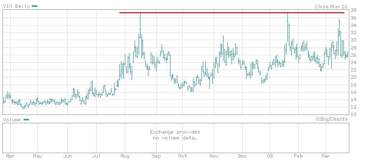 Nuestra última gráfica se refiere a la evolución intradiaria de la volatilidad de las bolsas a través del VIX, conocido índice del mercado de opciones y futuros de Chicago, o más popularmente “índice del pánico”. Puede verse cómo a lo largo del último año hay dos máximos correspondientes al mínimo de agosto, que dio lugar a un gran rebote que tardó 5 meses en ser perforado, y al mínimo del lunes negro (martes en el caso americano) de enero, que a fecha de hoy sigue siendo un nivel significativo. La mala noticia es que la economía real sigue sin dar síntomas de mejoría.