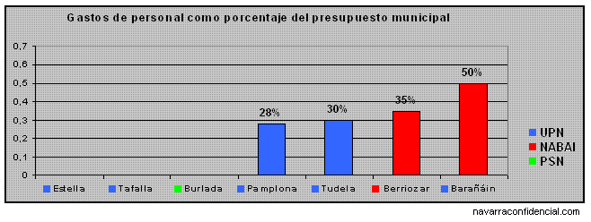 Como ustedes pueden ver, tampoco nos hemos resistido a identificar cada ayuntamiento analizado con el color del partido político que lo gobierna. Puede apreciarse que de entre los principales ayuntamientos navarros de los que tenemos datos, todos se encuentran por debajo del nivel crítico del 60%. Mientras que el mejor ratio lo ostenta Pamplona, quien más se aproxima a esa barrera fatídica es Barañáin, con un 50%. En el caso de Barañáin, a pesar de estar gobernado actualmente por UPN, hemos utilizado el color rojo de Nabai en la gráfica puesto que la situación económica actual es una situación heredada. De hecho, fue precisamente esa situación la que desencadenó la crisis en el consistorio hace un año.