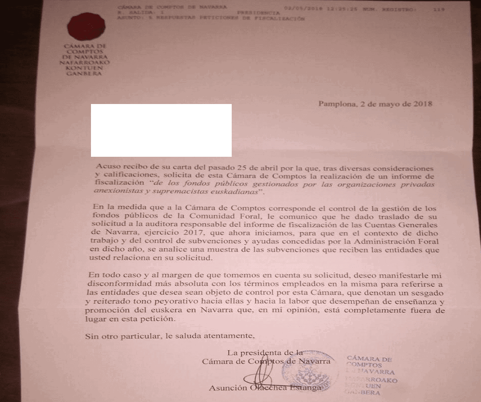 La presidenta, en este sentido, incluye en su respuesta a la petición un párrafo en el que señala que desea manifestar su “disconformidad más absoluta con los términos empleados en la misma para referirse a las entidades que desea sean objeto de control por esta Cámara, que denotan un sesgado y reiterado tono peyorativo hacia ellas y hacia la labor que desempeñan de enseñanza y promoción del euskera en Navarra que, en mi opinión, está completamente fuera de lugar en esta petición”. La presidenta parece referirse a expresiones contenidas en la petición en las que, por ejemplo, se califica a las entidades cuya fiscalización se reclama como “organizaciones privadas anexionistas y supremacistas euskadianas”.