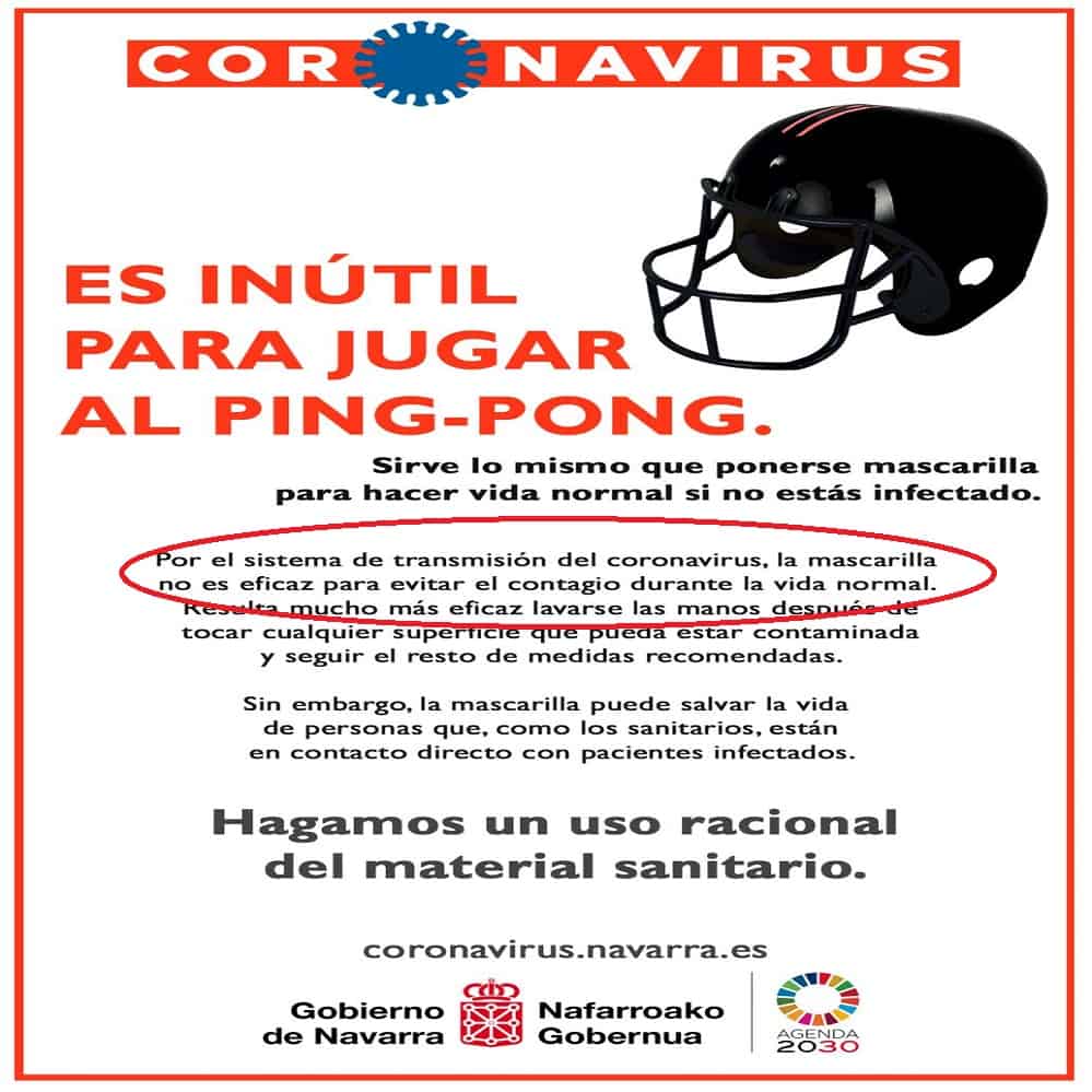 Sin embargo, el tiempo va revelando que nadie ha propagado bulos con la misma intensidad e irresponsabilidad que las fuentes oficiales y gubernamentales. El asunto es muy grave porque se trataba de consejos e informaciones que iban totalmente en contra de nuestra salud. Ahora que el gobierno convierte la mascarilla en obligatoria conviene recordar lo que decía hace poco más de un mes. En concreto resulta llamativa la campaña del Gobierno de Navarra afirmando que ponerse una mascarilla no estando infectado era como jugar al ping ping con un casco de rugby.