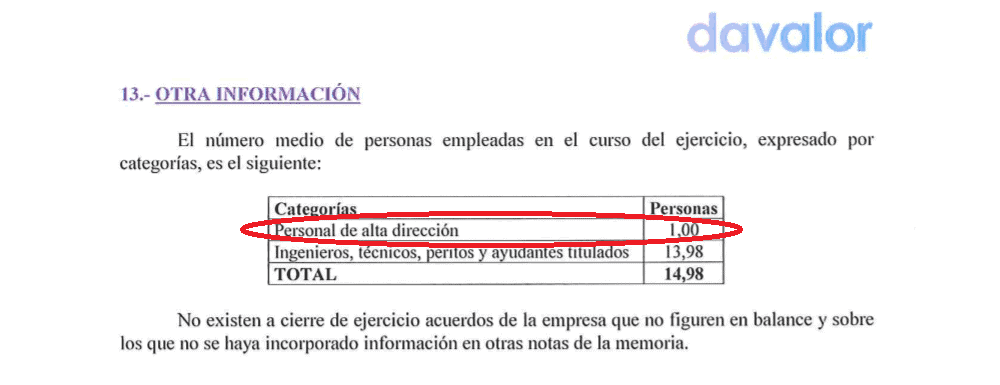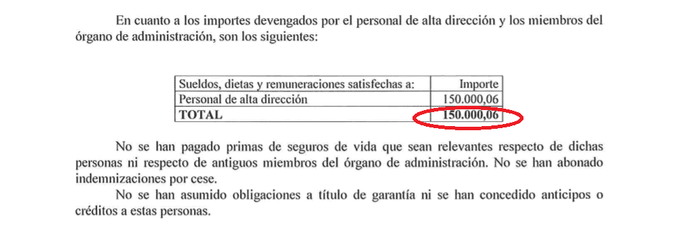 Un poco más adelante, en esa misma auditoría, nos encontramos con que el número medio de personas que durante el pasado ejercicio ocuparon un puesto en la alta dirección de la empresa fue de 1. Es decir, todo indica que esos 150.000 euros son el salario de Juan José Marcos.