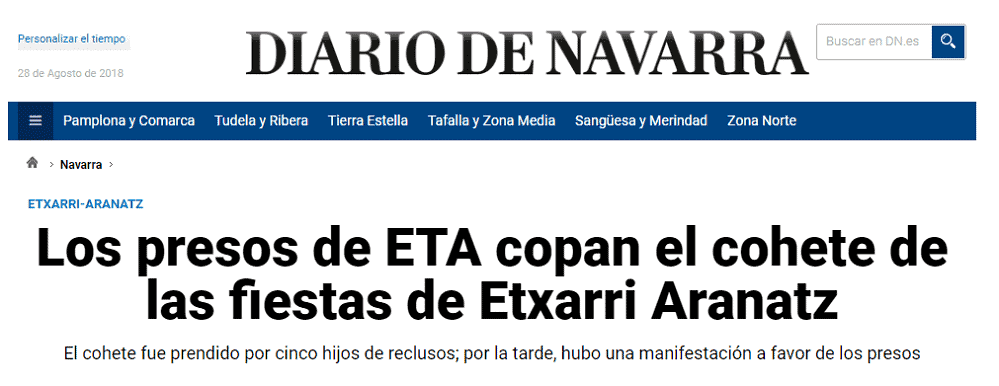 Retrocediendo en la información foral hasta principios de agosto, una de las noticias más abyectas de los últimos tiempos fue que el Ayuntamiento de Echarri Aranaz, gobernado con mayoría absoluta por Bildu, había cedido el privilegio de lanzar el Chupinazo que da inicio a las fiestas de la localidad a los hijos de los etarras del pueblo que están en la cárcel.