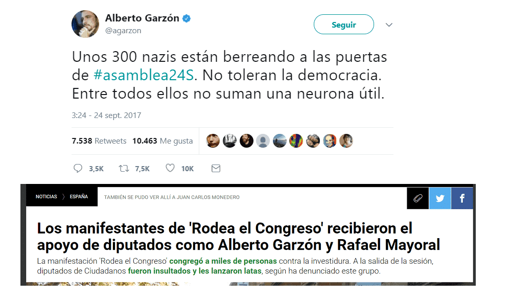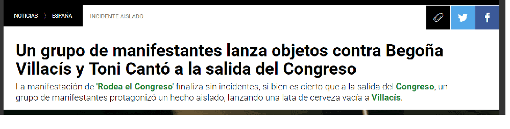 Es difícil no ceder a la tentación de comparar este suceso con otro de octubre de 2016, concretamente la iniciativa “rodea el Congreso”, aplaudida por Podemos. Varias diputadas de Ciudadanos fueron insultadas cuando salían del hemiciclo y a Begoña Villacís le arrojaron una lata de cerveza. Si aún a fecha de hoy buscamos la noticia en La Sexta se califica este lanzamiento como “hecho aislado”, no vallamos a pensar que todos los congregados entonces eran antidemócratas y violentos.