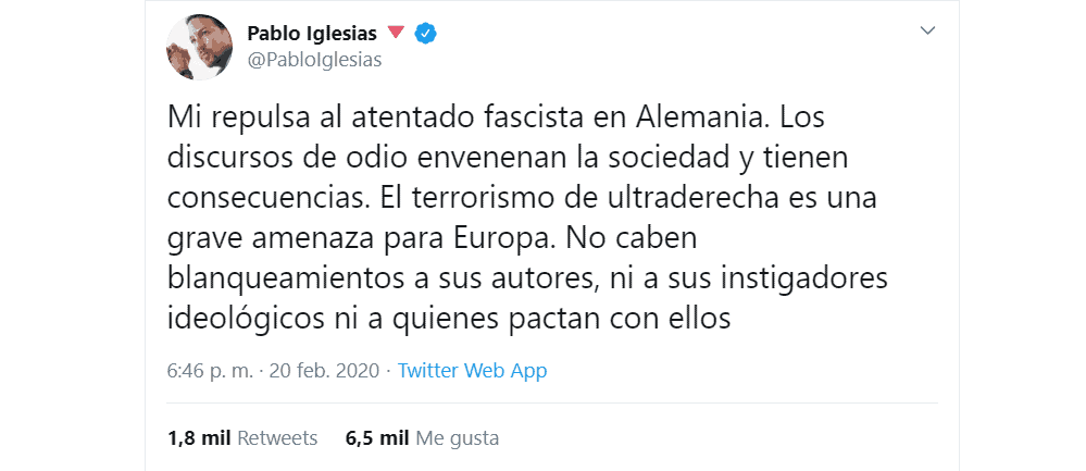 Pablo Iglesias asegura en su tuit que la masacre de Alemania es consecuencia de un discurso del odio que envenena la sociedad y que, además del autor material, la masacre tiene instigadores ideológicos que son corresponsables, así como los que pactan con ellos. Como siempre que habla Pablo Iglesias, la cuestión es si esta teoría de la responsabilidad criminal es aplicable sólo a los grupos o personas de derechas o a todos los violentos, también a los que comparten las ideas de Pablo Iglesias.