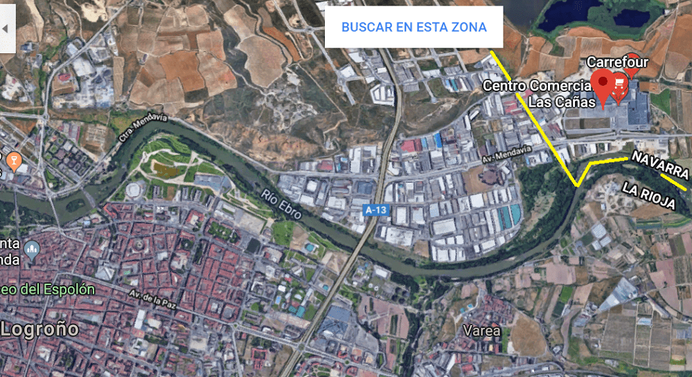 El Carrefour de Las Cañas se abre en el año 2003 y su ubicación resulta bastante llamativa porque se encuentra junto a Logroño, pero en territorio navarro. No muy internado en el territorio navarro, sino un paso dentro de territorio navarro. Es como si Carrefour se hubiera alejado todo lo necesario de Logroño para ubicar el establecimiento en territorio foral, gozando de la entonces atractiva fiscalidad de Navarra, pero ni un paso más de lo necesario para alejarse de su mercado principal en Logroño. El mapa resulta bastante descriptivo de lo que les estamos diciendo.