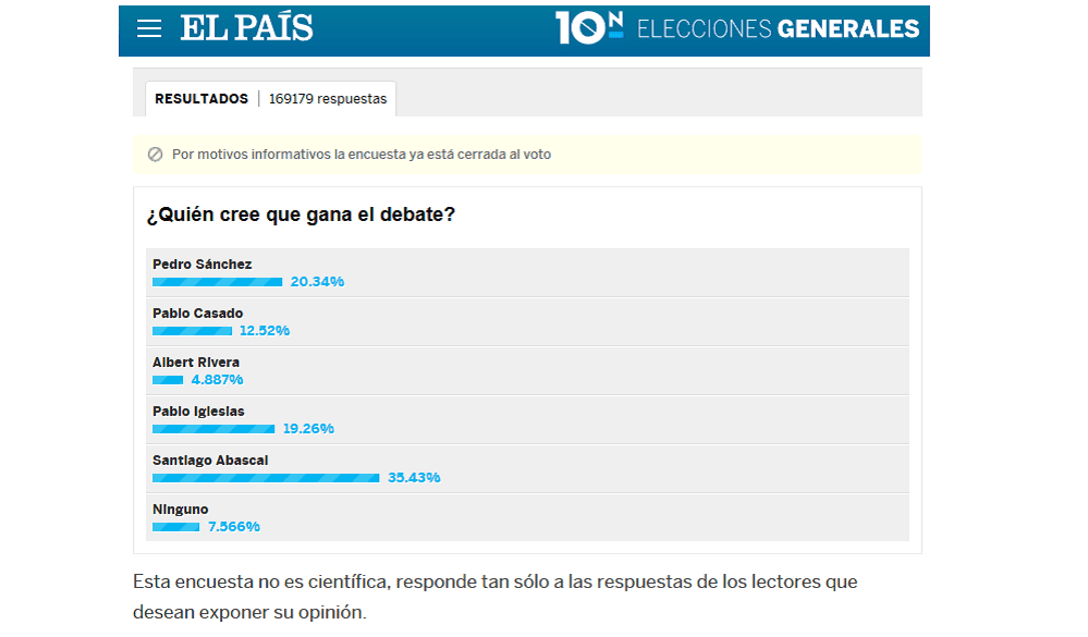 Ganó Abascal. No según Navarra Confidencial, sino según El País, que organizó la tradicional encuesta para medir el éxito en esta clase de eventos y resultó que venció el candidato de VOX. No podemos hacer este tipo de encuestas y creerlas sólo cuando conviene, aunque esto le pasó un poco al diario de PRISA, que intentó explicar el resultado alegando que “Abascal ha sido el más apoyado, seguido por Sánchez, gracias a la movilización en redes y a través de aplicaciones de sus formaciones”. La explicación es casi peor, porque se supone que todos los partidos tratan de generar impacto en las redes y movilizar a la gente. Si esto sólo lo consigue VOX dice poco de los demás. Si esto sólo lo intenta VOX dice menos aún. Lo raro es que Sánchez quedara segundo, ahí sí que tuvo que haber movilización. Incluso sin la encuesta de El País, si todo el post-debate gira sobre lo que dijo o dejo de decir Abascal y lo bueno o lo malo que es Abascal, queda bastante claro que ganó el debate Abascal.