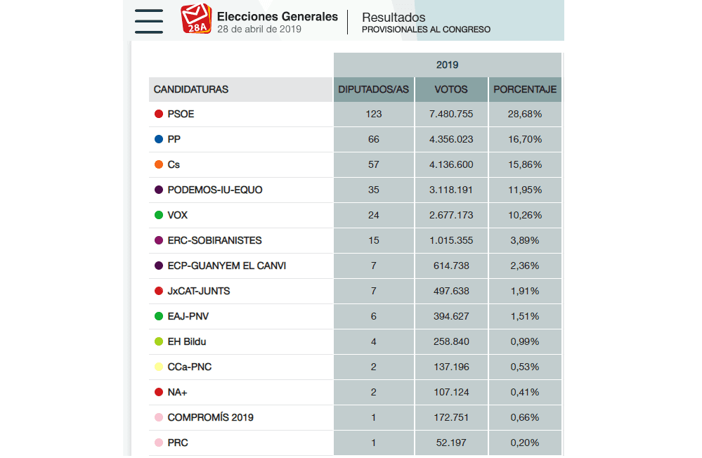 En el año 1977, la UCD y Alianza Popular obtuvieron el 42,5% de los votos. Este fue por tanto el resultado del bloque de centro-derecha hace 42 años. El 28 de abril, el resultado del bloque de centro-derecha compuesto por PP+CS+VOX obtuvo el 42,8% de los votos. Se trata de casi exactamente el mismo resultado, si acaso muy levemente superior.