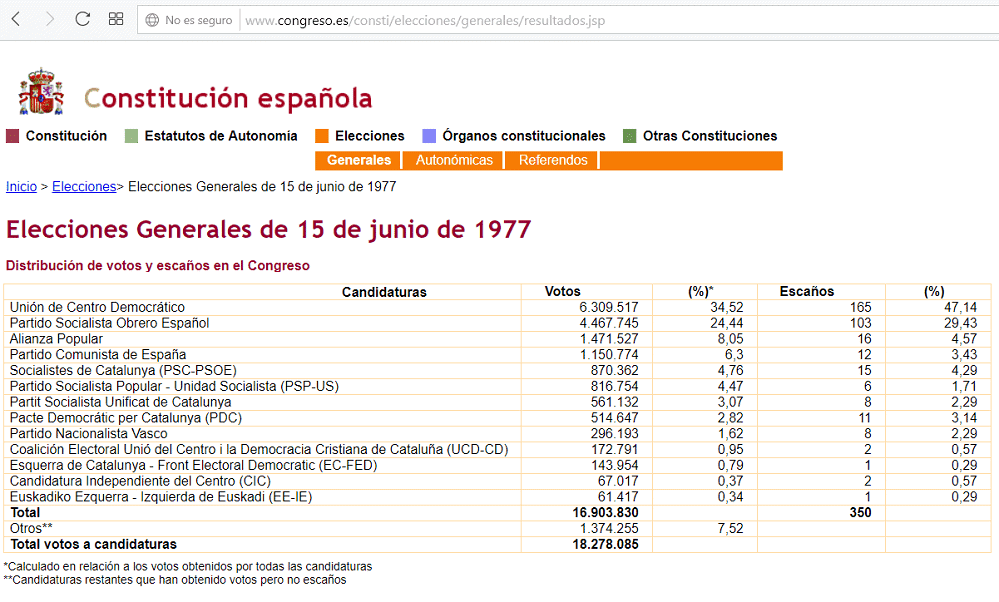 En lo que se refiere al PSOE, cuando nos remontamos a 1977 nos encontramos con que el PSOE y el PSC obtuvieron el 33,6% de los votos, frente al 28,6% que obtenía Pedro Sánchez hace unos días, algo que sin embargo estamos calificando como un gran éxito del socialismo.