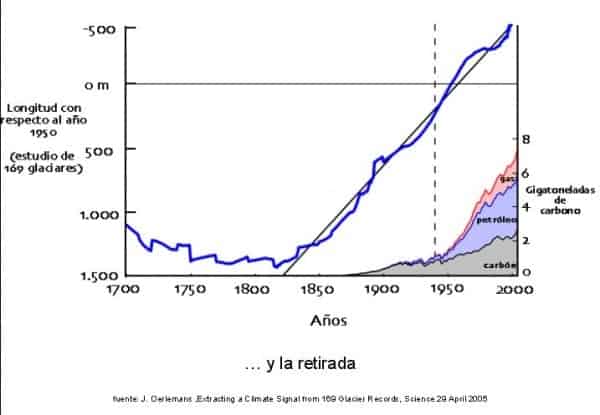No obstante lo anterior, existen personas para quienes estos datos no resultan concluyentes y contrastan con otros datos. Es el caso de don Antón Uriarte a quien, durante su paso por Navarra para pronunciar una conferencia, no recordamos que entrevistara ningún medio navarro. Don Antón, sin embargo, tuvo la amabilidad de compartir con Navarra Confidencial algún material del que ahora podemos echar mano. Así, respecto a los glaciares, el siguiente gráfico muestra cómo efectivamente vienen retrocediendo hace años, pero tantos que hay que remontarse a una época anterior a las emisiones de CO2. En realidad, los datos revelan que los glaciares vienen retrocediendo desde que terminó la denominada Pequeña Edad de Hielo, hace casi dos siglos.