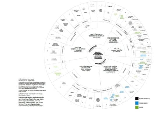 Otra vez la dichosa Rueda que tanto le gusta a Goñi. En vez de hacer un organigrama normal, lo hace redondo queriendo decir que no hay reinos de taifas, ni compartimentos estancos. Mentira, pero de las gordas. Sólo se lo cree él (que yo creo que tampoco). Que chorrada de organigrama. Si da igual como lo pinte. No hay estructura más jerárquica en la faz de la tierra que la que crea Goñi. El es dios y todos los de alrededor sus apóstoles, que bailan a su son.