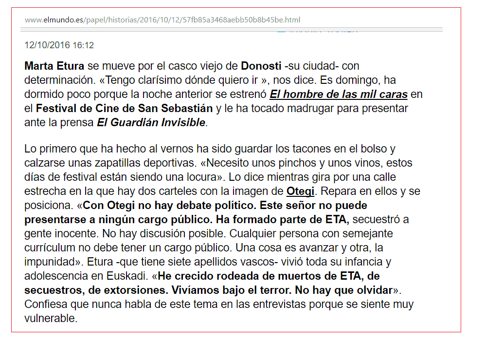 Entre quienes se oponían a la posibilidad de que justos pagaran por pecadores, hubo quien recordó que, por ejemplo, la protagonista de la película, la actriz donostiarra Marta Etura, recientemente realizó unas valientes declaraciones recordando y señalando el pasado y la verdadera cara de alguien como Arnaldo Otegui, ante los intentos de la izquierda abertzale y algunos medios por blanquear su pasado.