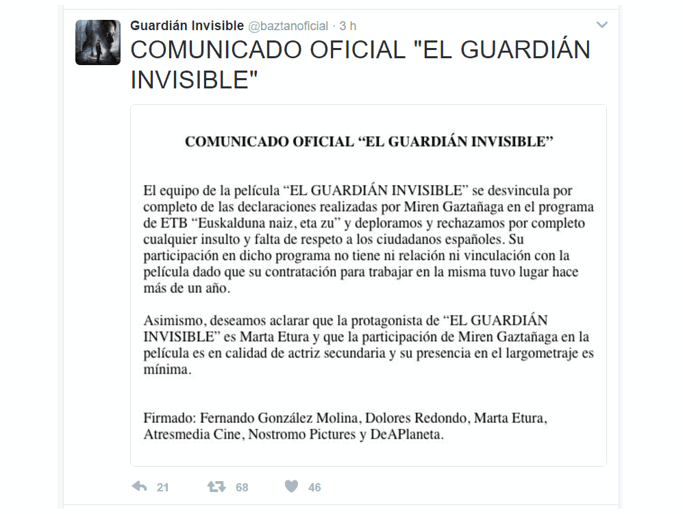El equipo de la película, ante la magnitud de los acontecimientos, decidió ayer a última hora hacer público un comunicado desvinculándose de las declaraciones de Miren Gaztañaga, rechazando y deplorando su contenido, señalando que es una actriz totalmente secundaria en el reparto y que su presencia en la película es “mínima”. El comunicado lo firman como figuras principales el director, la actriz protagonista y la autora de la novela.