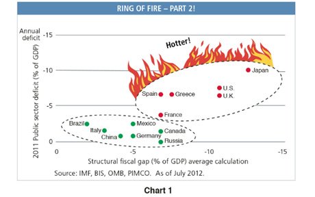 A semejanza del mapa sísmico y volcánico anterior, también es posible realizar un mapa de peligrosidad de los países con más riesgo de solvencia en su deuda soberana. El elemento determinante en este caso es el déficit. España ha incurrido en un enorme déficit presupuestario desde el estallido de la burbuja de crédito e inmobiliaria, a consecuencia de la depresión económica consiguiente. En el caso de los EEUU o Francia no deja de ser preocupante que el elevado déficit se está produciendo incluso con la economía en crecimiento. ¿Qué pasará cuando en estos países cambie el ciclo económico? El resultado es que todos los inversores del mundo, de un modo u otro, tienen ya este mapa o similar en la retina con el “Anillo de Fuego” de los países cuyas cuentas públicas presentan acusados desajustes financieros. No les estamos exagerando demasiado porque el mapa que les mostramos a continuación ha sido publicado por FORBES y elaborado por PIMCO, una de las compañías de inversión en renta fija más importantes del mundo. La conclusión es que la amenaza de un tsunami en la deuda pública global es algo más que una posibilidad remota e impensable y que, si suenan las primeras alarmas, quedarse jugando en la orilla con el cubo y la pala no resultará recomendable. Lo que es peor: las políticas de tolerancia con el déficit que se están aplicando, especialmente por parte de Obama, van justo en dirección contraria a rebajar los desequilibrios que pueden desencadenar el tsunami planetario.