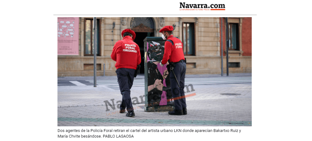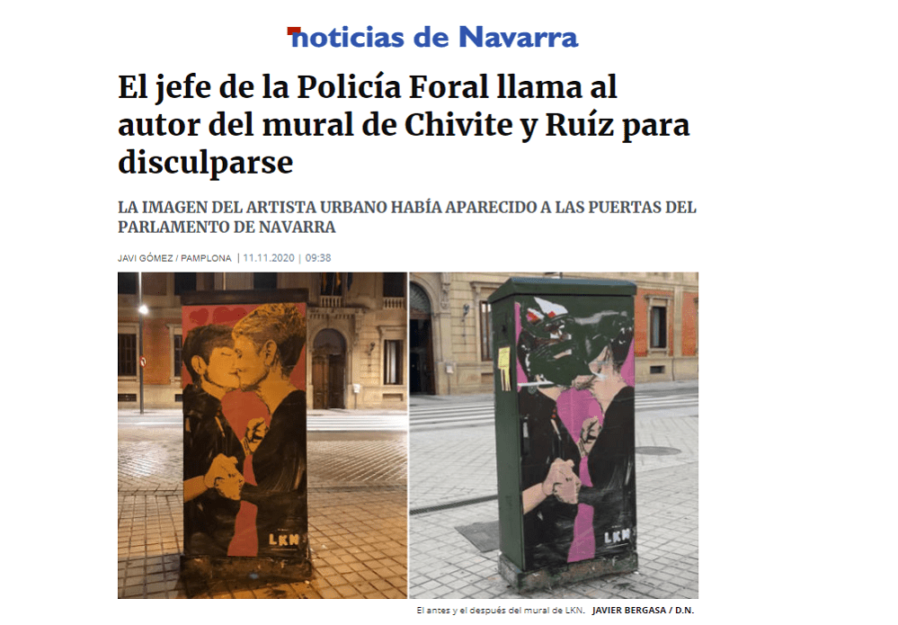 Los hechos son los siguientes: ayer el artista navarro LKN, a veces denominado “el Bansky foral”, tuvo la ocurrencia de celebrar el pacto presupuestario entre PSN y Bildu con el dibujo de un beso en la boca entre María Chivite y Bakartxo Ruiz, emulando el famoso beso en el Muro de Berlín entre Honecker y Breznev. El artista colocó a las 6 de la mañana el dibujo sobre la caja de registro situada en el Paseo Sarasate frente al Parlamento de Navarra.