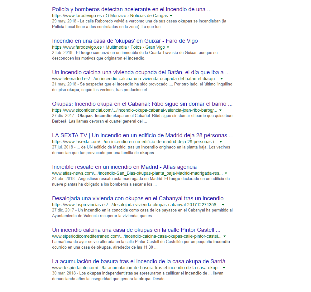 Una búsqueda en Google con los términos “incendio” y “okupas” inmediatamente arroja multitud de resultados preocupantes. Efectivamente, las casas okupas muestran una sospechosa proclividad a sufrir incendios, de los que las víctimas son a veces los propios okupas, a veces también los vecinos y siempre la generalidad de los ciudadanos, cuando el inmueble que arde es un edifico de titularidad pública. Esta es una captura sólo de los primeros resultados de los muchos que nos aparecen en Google.