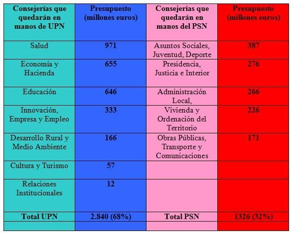 El anterior desglose nos lleva a concluir que, medido el peso de cada cual en euros del presupuesto foral, UPN gestionará aproximadamente un 68% de los Presupuestos por un 32% que gestionará el PSN. El reaparto se corresponde de manera casi milimétrica con la aportación de cada uno a la coalición medida en escaños, donde UPN aporta el 67,8% de los diputados. El esquema también se corresponde exactamente al planteado por Miguel Sanz tras las elecciones, cuando irrumpió con unas declaraciones en las que proponía “un gobierno de coalición proporcionado”. Incluso dentro de UPN se consideró entonces que se trataba de una concesión excesiva, teniendo en cuenta que el PSN sólo negociaría con UPN a falta de otra opción y por tanto con escasa capacidad de presión. Con Sanz apoyando públicamente una oferta tan generosa, parece que el «gobierno proporcionado» automáticamente se convirtió en un mínimo para el PSN. Y así parece haberse materializado en el acuerdo con UPN. Y en el dinero que manejara cada uno.