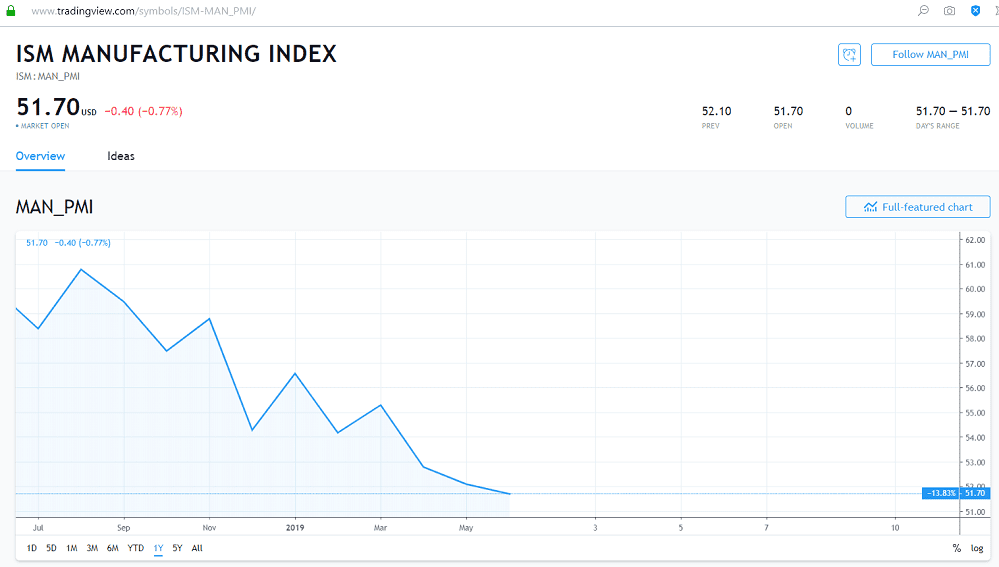 Uno de los indicadores que nos está enviando señales de alarma es el llamado Indice PMI o su equivalente estadounidense, el ISM. El PMI o en español Índice de Gestores de Compras es un reflejo en una serie de variables de las expectativas para los próximos meses de las empresas. Lecturas en estos índices por encima de 50 se asocian a crecimiento y por debajo a recesión. Pues bien, el índice ISM en los EEUU, en el sector manufacturero, acaba de bajar a 51,7, que indica por tanto crecimiento, pero que viene bajando desde el verano pasado y es ya el dato más bajo en 2 años y medio.