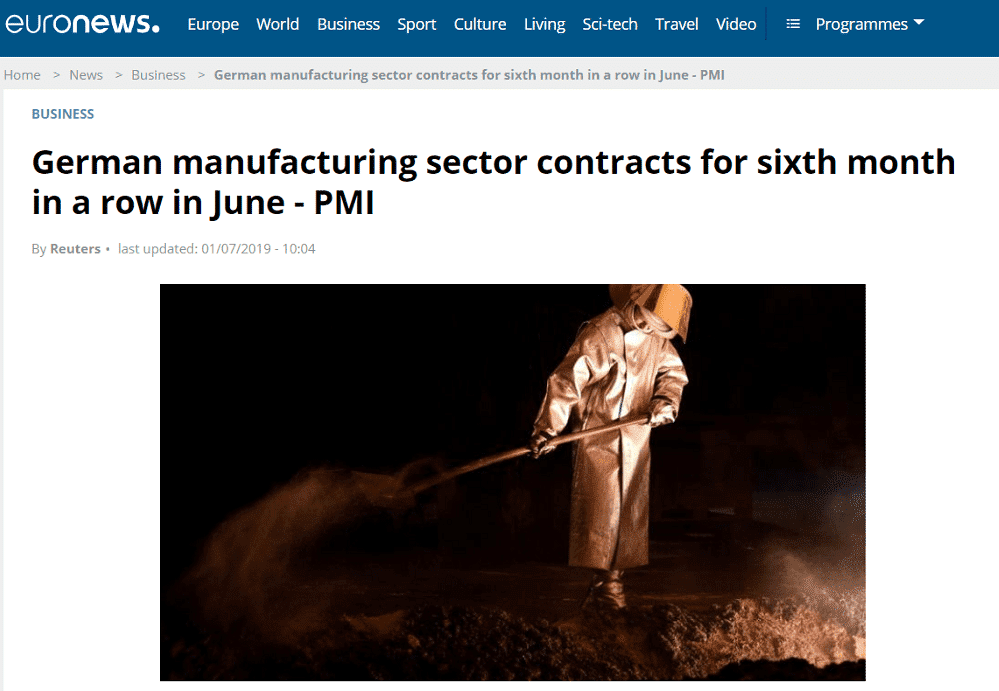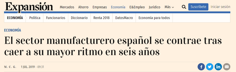 El problema se agudiza cuando observamos las últimas lecturas de estos mismos índices para Europa. el PMI alemán ha bajado a 45 y encadena seis meses seguidos por debajo de 50. En cuanto a España, el ´PMI ha bajado a 47,5 en junio, y es la primera vez en 5 años y medio que se coloca por debajo de 50.