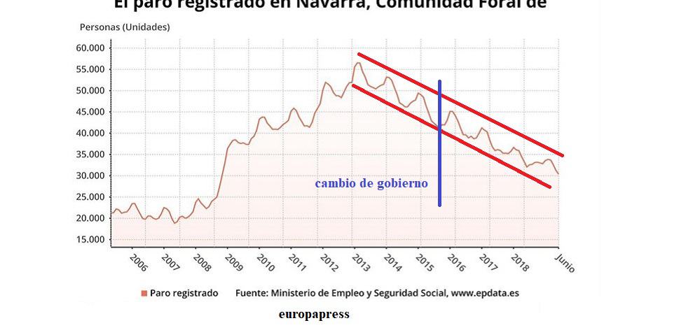 En el caso de Navarra, acabamos de conocer por ejemplo los últimos datos de paro registrado y, más allá de la bondad de las cifras, lo que observamos en la gráfica es que la recuperación del empleo no comienza con el gobierno del cambio, sino con el gobierno anterior, y tampoco simplemente coincidiendo con el gobierno anterior, sino con la recuperación económica global. Lo que observamos por tanto es que el gobierno cuatripartito simplemente ha seguido cabalgando la ola de la recuperación, que la recuperación no se inició con el gobierno del cambio y que el gobierno del cambio, en realidad, tampoco lo ha hecho mejor, sino que ha seguido exactamente la evolución marcada tras el pico económico anterior.