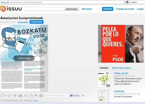 Amaiur, la formación que aglutuina a Bildu, Aralar y EA, ha sido acusada de concurrir a las urnas sin programa electoral. De hecho, no existe un documento como tal de Amaiur titulado “Programa Electoral”. Lo único que existe es un tríptico en español y en vascuence cuyo contenido ocuparía aproximadamente folio y medio. Para consultar este tríptico, se puede pulsar desde la web de Amaiur un enlace bajo el título “Kompromisoak/Compromisos”. Curiosamente, el enlace redirige las visitas a una web de alojamiento donde se puede consultar el documento. Lo llamativo es que en esta web, al consultar el documento, al menos en las últimas horas aparece un anuncio electoral del PSOE con la imagen de Rubalcaba. Seguramente, cosas de Internet, existen pocos precedentes de una formación política que se anuncia en el programa electoral de otra. La imagen de este gol del PSOE a Amaiur, cuanto menos, resulta curiosa: