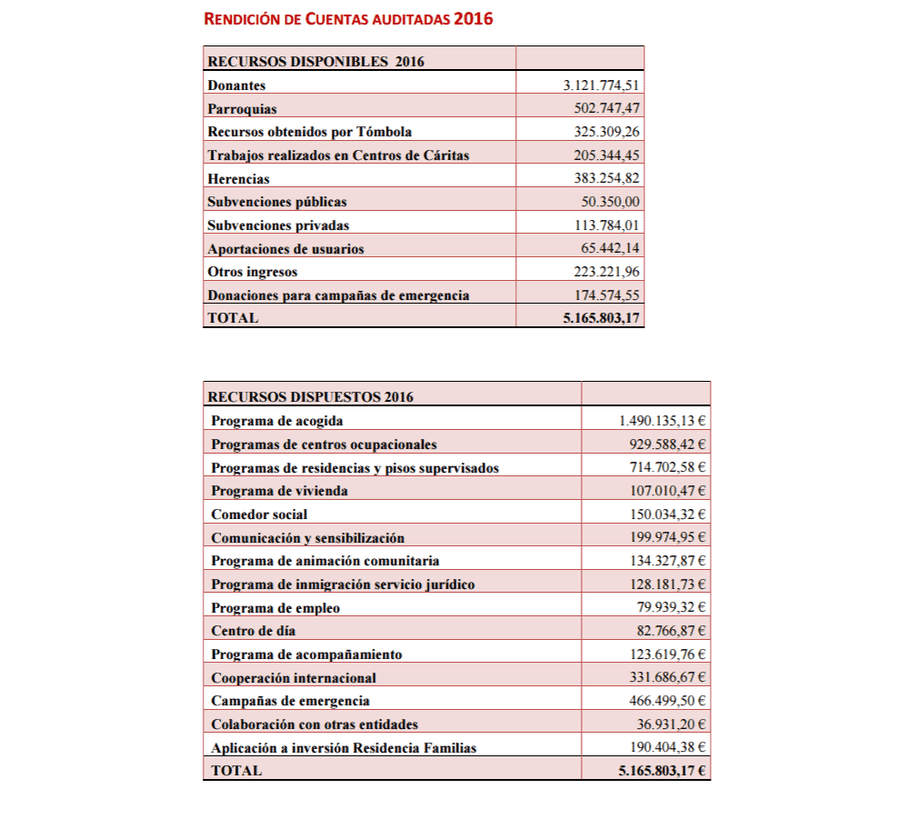 Las noticias sobre Cáritas se completa con la presentación de las cuentas 2016, en las que se aprecia que, sin descartar que entre los donantes pueda haber instituciones públicas, sobre 5,16 millones de euros sólo 50.350 euros corresponden a subvenciones públicas, un 1%.
