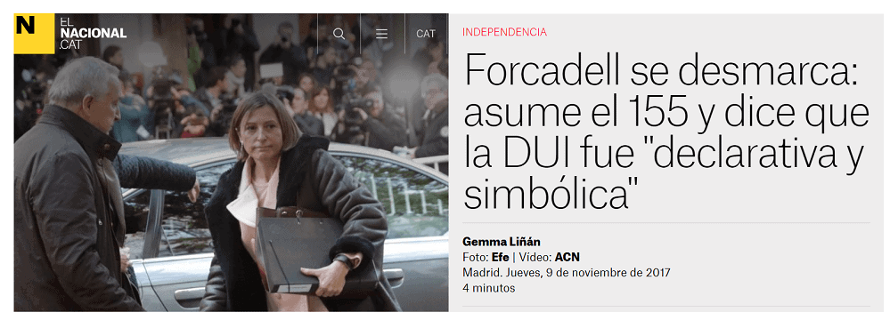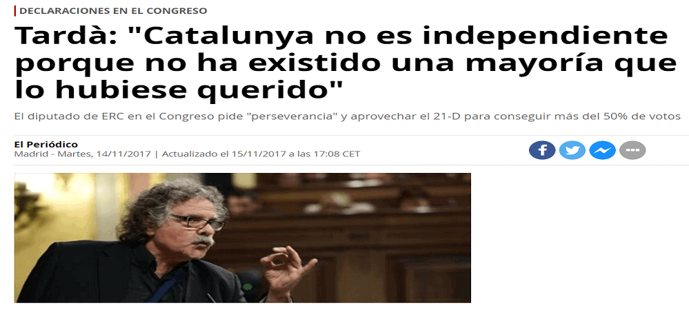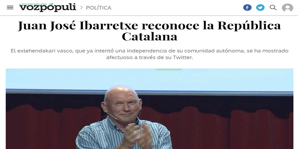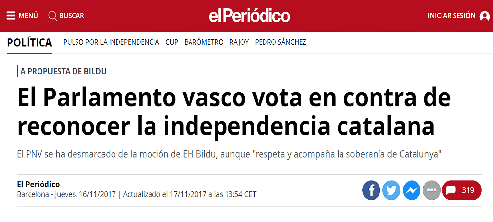 En Navarra fue el PSN quien presentó en el Parlamento foral una declaración rechazando la declaración unilateral de independencia que resultó aprobada gracias a los votos del propio PSN, UPN, PPN e IU. Es decir, que Bildu, Geroa y Podemos no rechazaron la declaración de la independencia de broma de la república de Cataluña. O dicho de otro modo PSN, UPN, PPN y en este caso también IU libró por una vez de hacer un completo ridículo al parlamento foral. Si hasta los propios separatistas reconocen ahora que no tenían ni el 50% del apoyo de los catalanes, ¿qué diablos apoyaron Geora Bai, Podemos y Bildu? ¿La declaración unilateral de independencia de la república antidemocrática de Cataluña?
